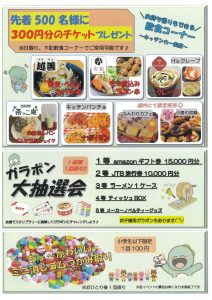 ガラポン抽選会 1組様1回限り 1等Amazonギフト券15,000円分 2等JTB旅行券10,000円分 3等ラーメン1ケース 4等ティッシュBOX 5等メーカーノベルティーグッズ