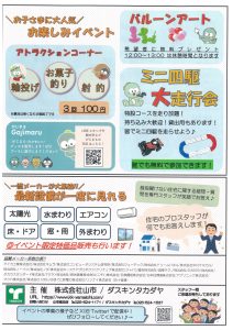 お子様に大人気!お楽しみイベント ①アトラクションコーナー 3回100円 ・輪投げ・お菓子釣り・射的 ②バルーンアート ③ミニ四駆大走行会 誰でも無料で参加できます。自分のミニ四駆で走行できます。貸し出し用もあります。